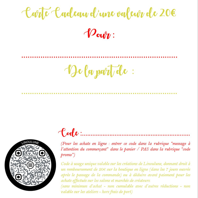 • Pour utiliser cette carte sur les salons et marchés de créateurs : présenter le code avant le règlement pour bénéficier d'une réduction de 20€ sur l'ensemble de vos achats.
