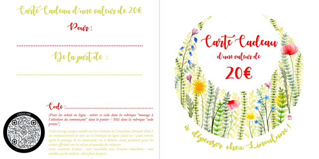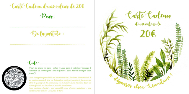 Vous recevrez par mail le visuel de la carte à imprimer ainsi qu'un code à usage unique offrant une réduction ou un remboursement de 20€ sur vos prochains achats (à utiliser en une seule fois, non valable sur les soldes et hors frais de ports)